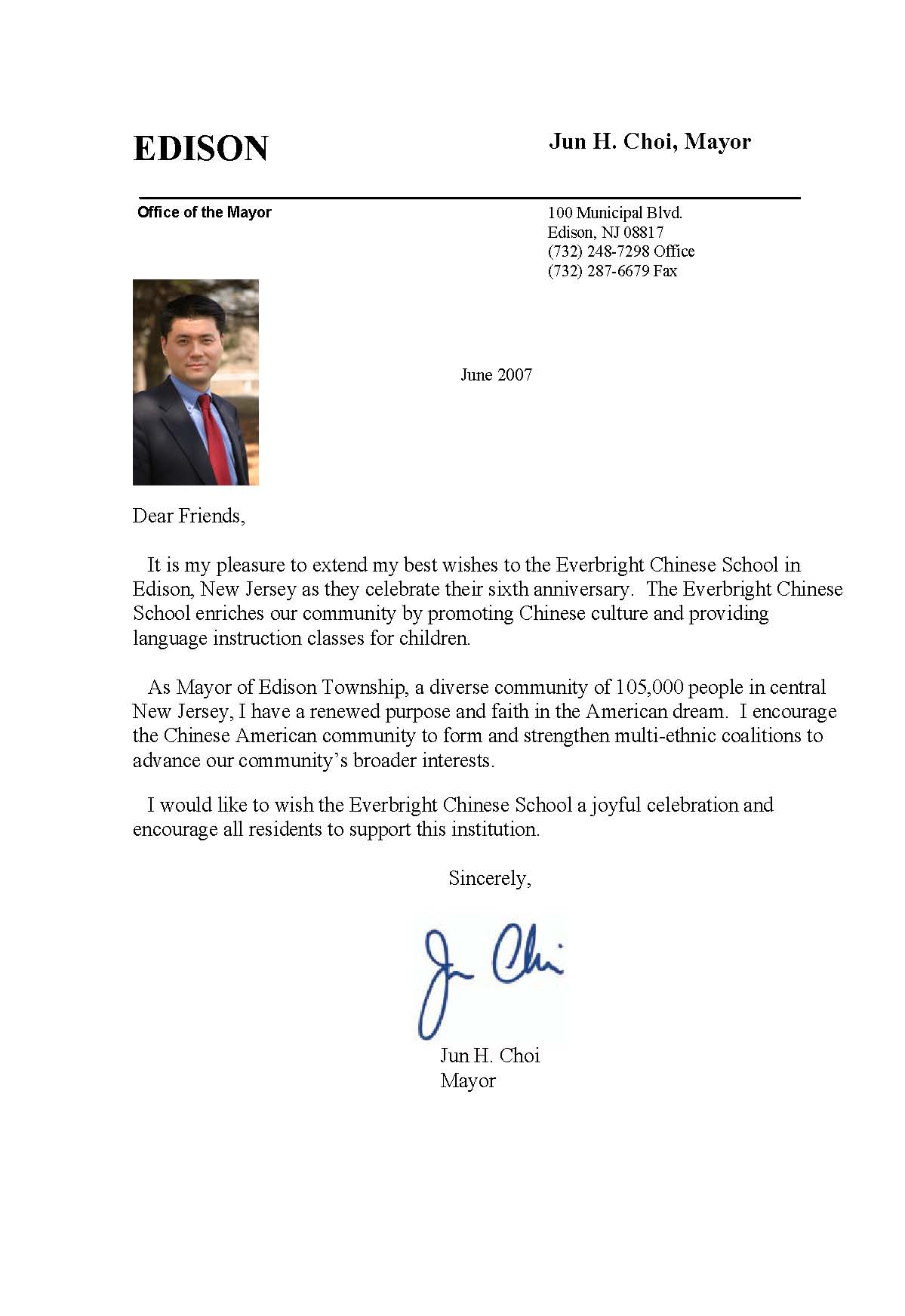 A Celebration letter from Edison Mayor for the 6th Everbright Anniversary party